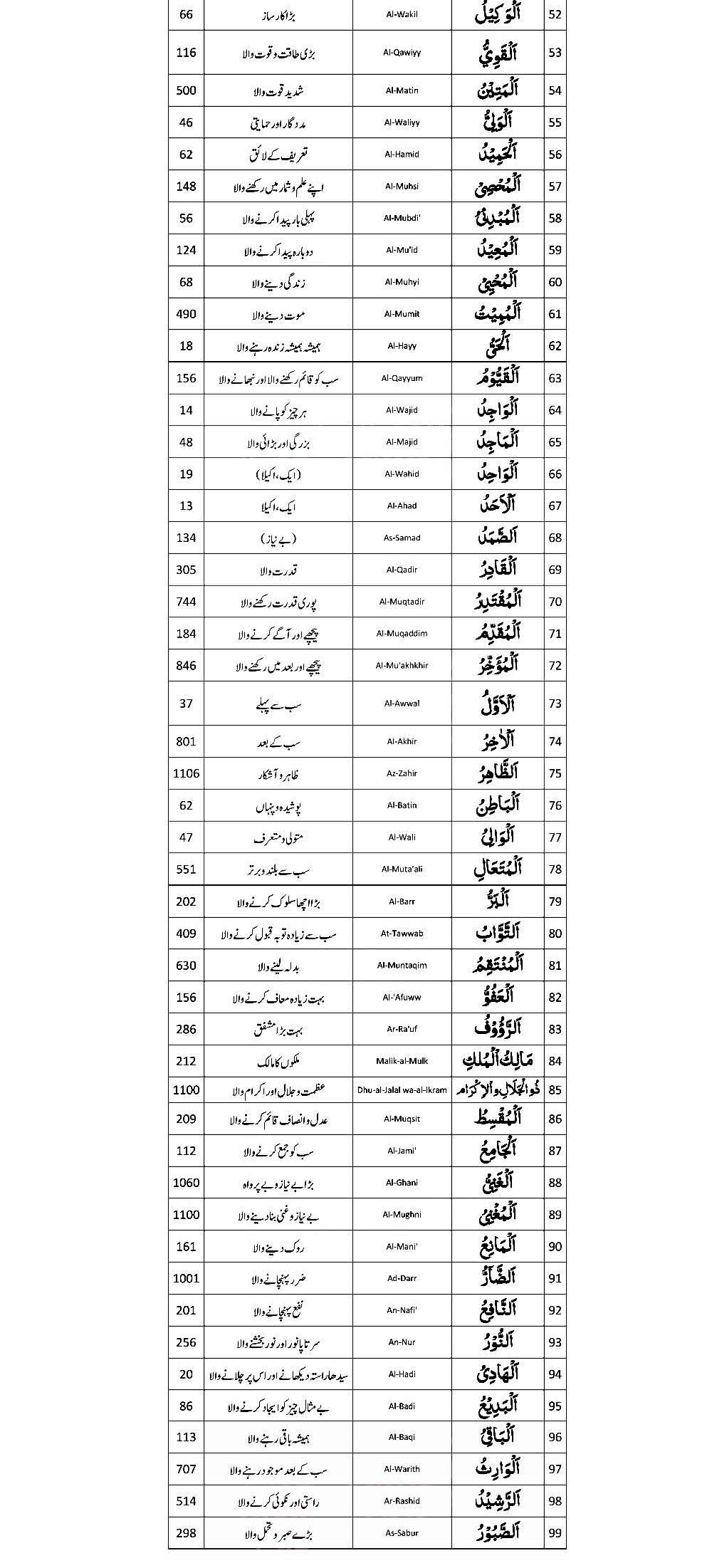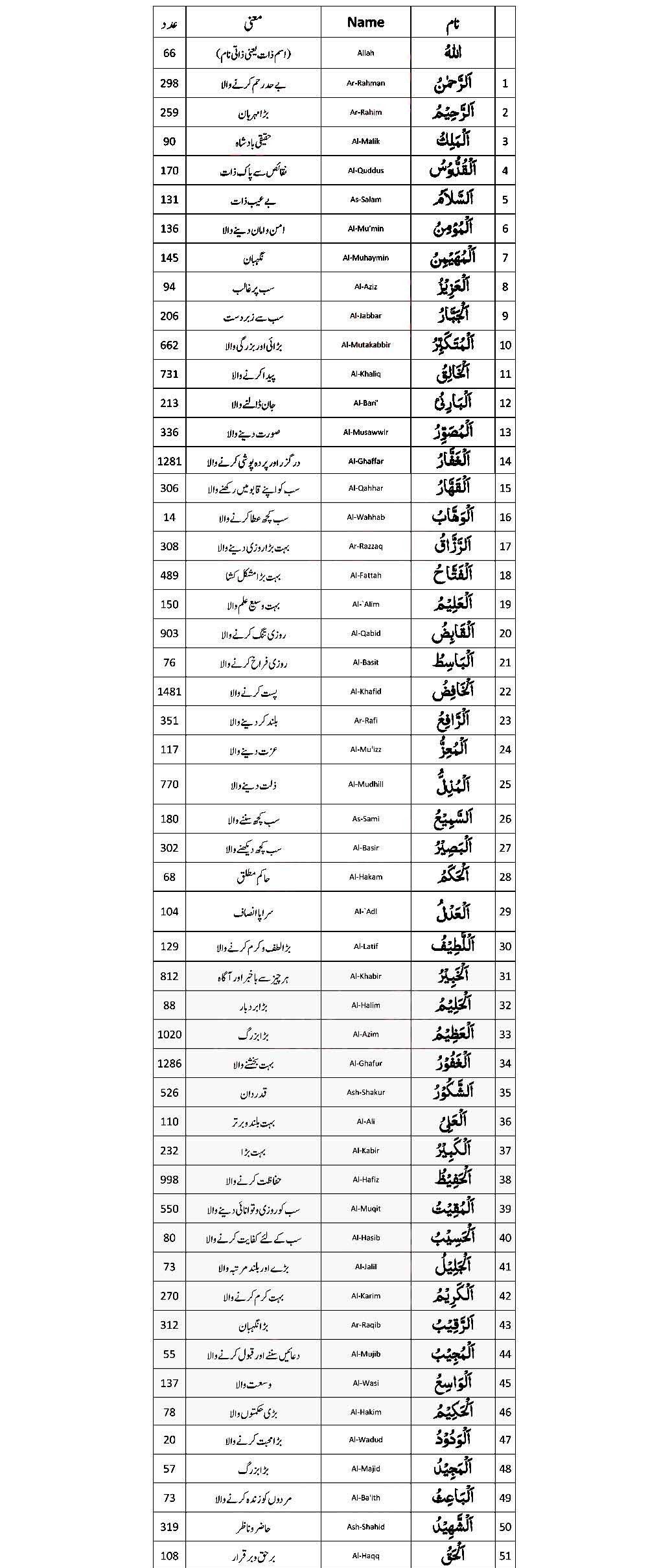 Narrated Abu Huraira: Prophet Muhammad SAW said, “Allah has ninety-nine names, i.e. one-hundred minus one, and whoever knows them will go to Paradise.” (Sahih Al-Bukhari 50:894)